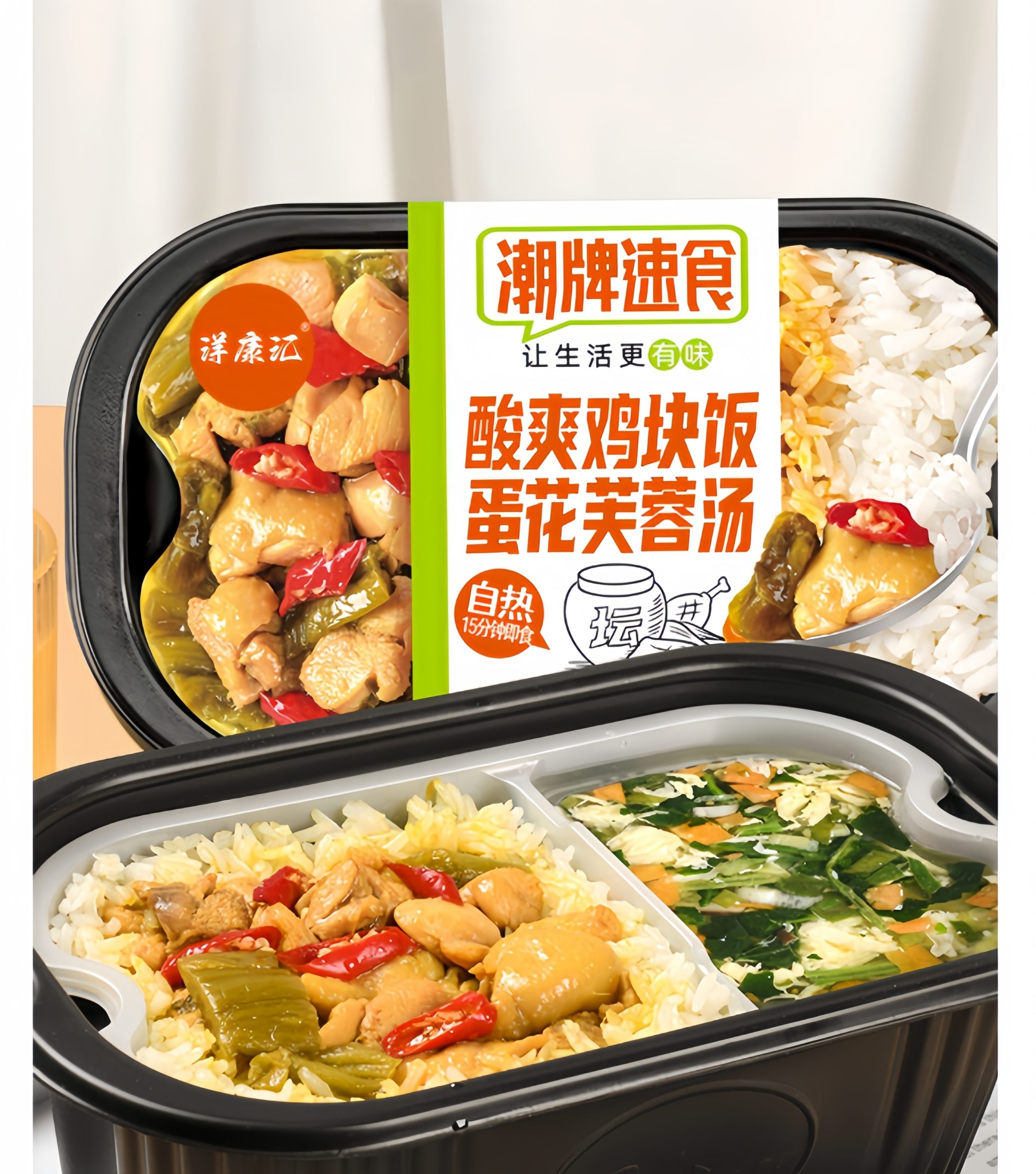 Get ready for a flavor adventure! This all-in-one meal combines tender chicken pieces in a zesty, tangy sauce with fluffy rice, balanced by a soothing egg drop soup. Our self-heating technology delivers a complete hot meal in 15 minutes — no cooking, no cleanup, just pure satisfaction.